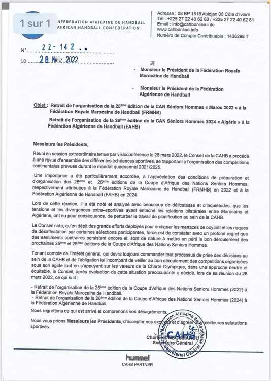 A ce sujet la circulaire 22-142 signée du secrétaire général de l’institution indique qu’il a été « noté et analysé avec beaucoup de délicatesse et d’inquiétudes, que des tensions et divergences extra sportives ayant entaché les relations bilatérales entre marocains et algériens, ont pour conséquence, de perturber le travail de planification au sien de la Cahb ».