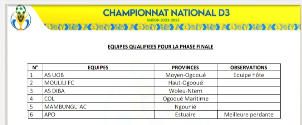 Au terme des phases éliminatoires dans les quatre poules, le championnat national de 3e division de football du Gabon, rentre dans sa dernière étape dite « finale » du 29 juillet au 6 août 2023 à Lambaréné. Ce, avec la participation des six meilleures formations, candidates au National Foot 2.