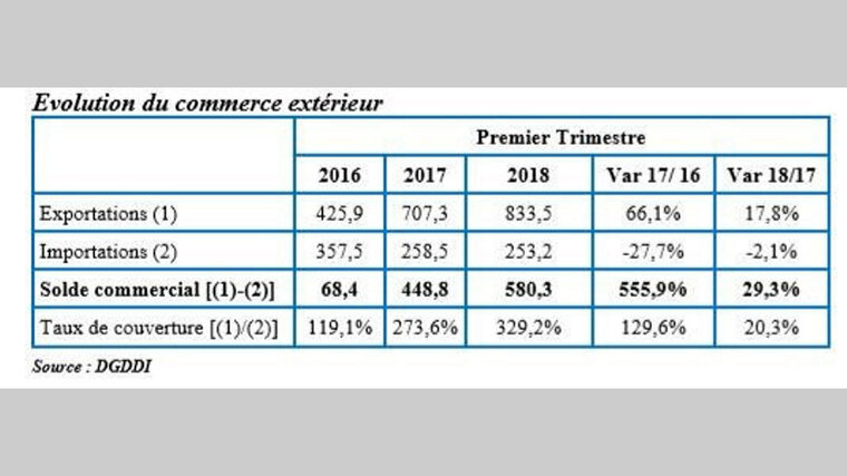 L’analyse comparative des données du premier trimestre de 2018 et 2017 indique que les exportations sont en nette progression entre les deux périodes. Les exportations sont passées de 707,3 milliards en 2017 à 833,5 milliards de francs, soit une hausse de 17,8%. Cette tendance, qui a débuté au quatrième trimestre 2017, est devenue plus vigoureuse à fin mars 2018. La progression des exportations s’explique essentiellement par la hausse des ventes de pétrole (+26,5%).