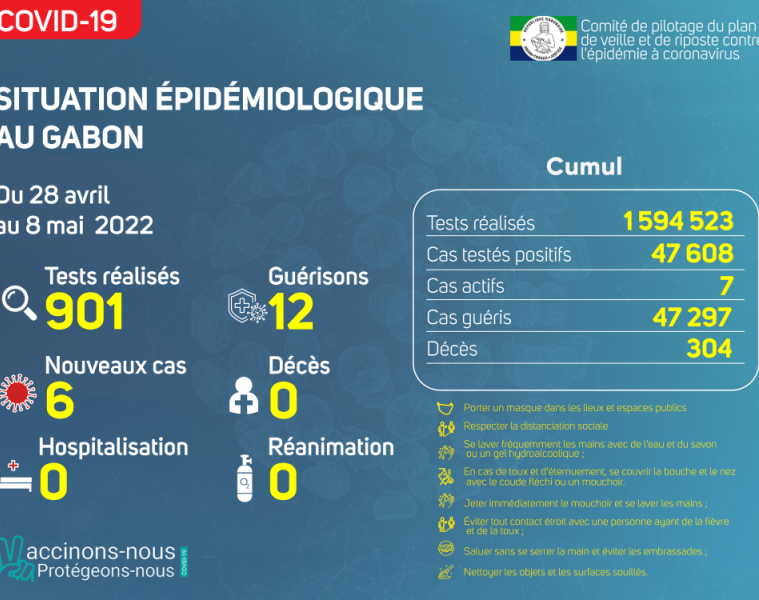 Le Gabon a enregistré 06 nouveaux cas positifs sur 901 tests réalisés, soit un taux de positivité de 0.7%, 00 personne hospitalisée dont 00 en réanimation, 12 nouvelles guérisons et 00 nouveau décès.