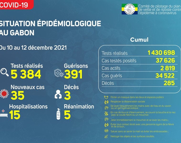 Gabon Matin vous livre le point journalier du Comité de pilotage du plan de veille et de riposte contre l’épidémie à Coronavirus au Gabon du 12 décembre 2021.