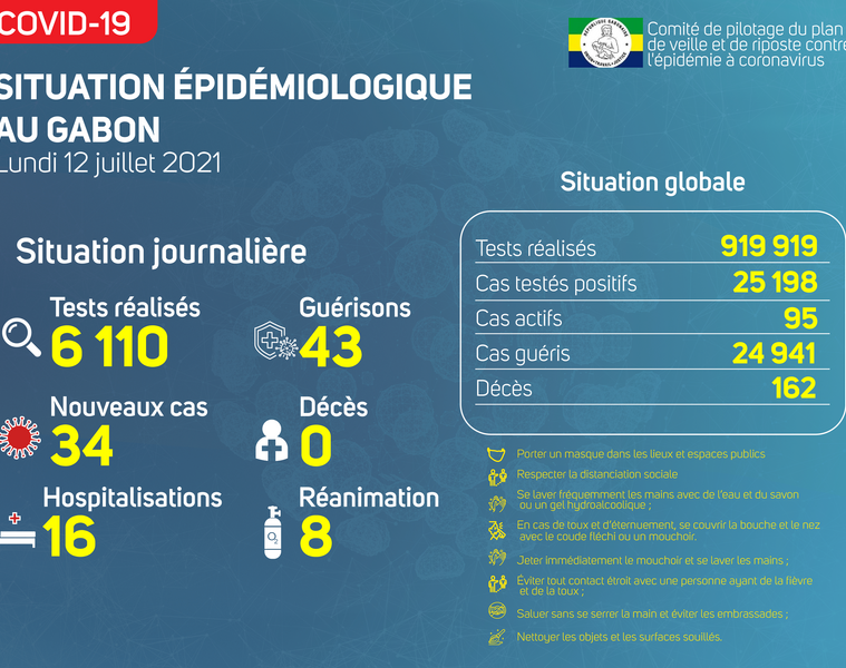 Gabon Matin vous livre le point journalier du Comité de pilotage du plan de veille et de riposte contre l’épidémie à Coronavirus au Gabon du 12 juillet 2021.