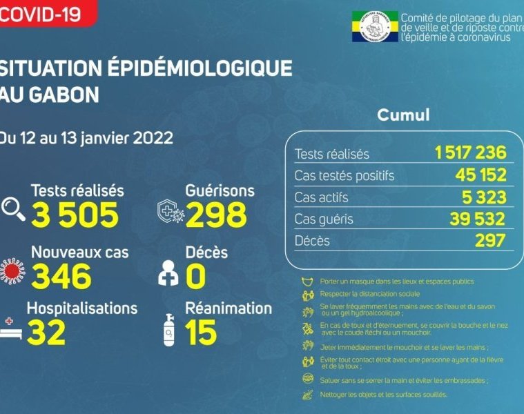 GabonMatin vous livre le point journalier du Comité de pilotage du plan de veille et de riposte contre l’épidémie à Coronavirus au Gabon du 13 janvier 2022.