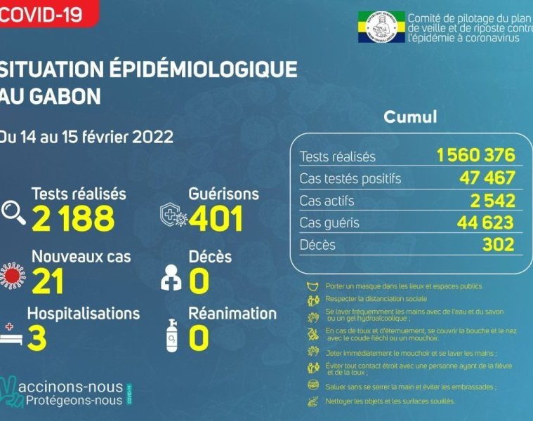 GabonMatin vous livre le point journalier du Comité de pilotage du plan de veille et de riposte contre l’épidémie à Coronavirus au Gabon du 15 février 2022.