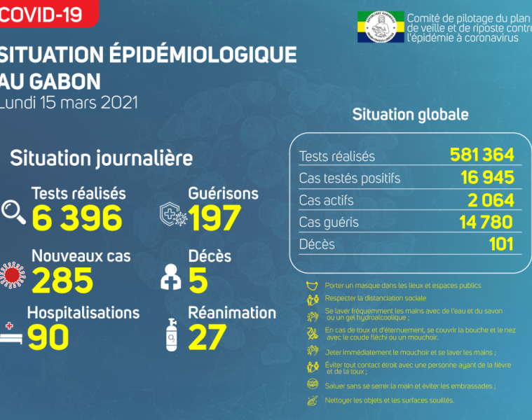Gabon Matin vous livre le point journalier du Comité de pilotage du plan de veille et de riposte contre l’épidémie à Coronavirus au Gabon du 15 mars 2021.