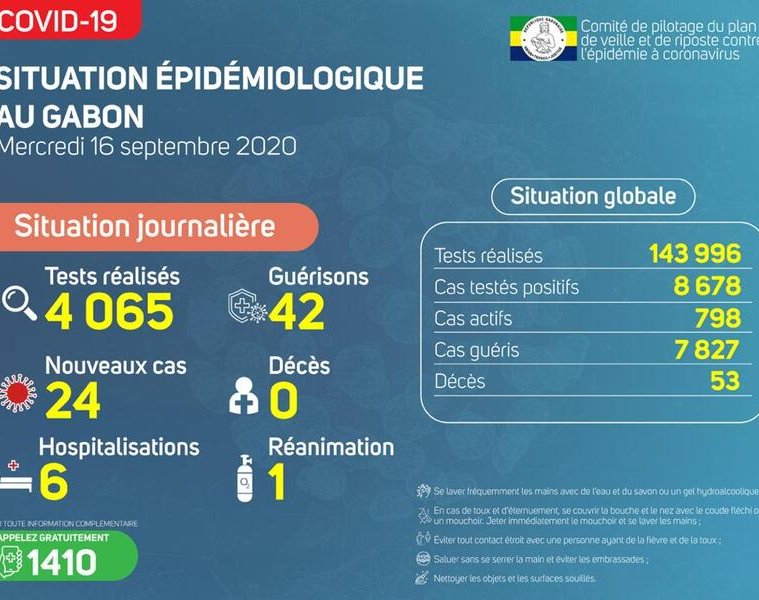 Gabon Matin vous livre le point journalier du Comité de pilotage du plan de veille et de riposte contre l’épidémie à Coronavirus au Gabon du 16 septembre 2020.