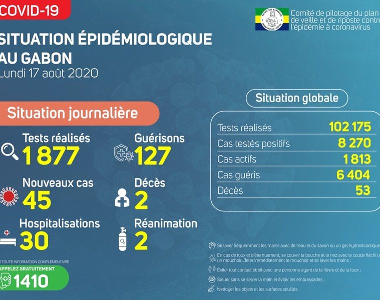 Gabon Matin vous livre le point journalier du Comité de pilotage du plan de veille et de riposte contre l’épidémie à Coronavirus au Gabon du 17 août 2020.
