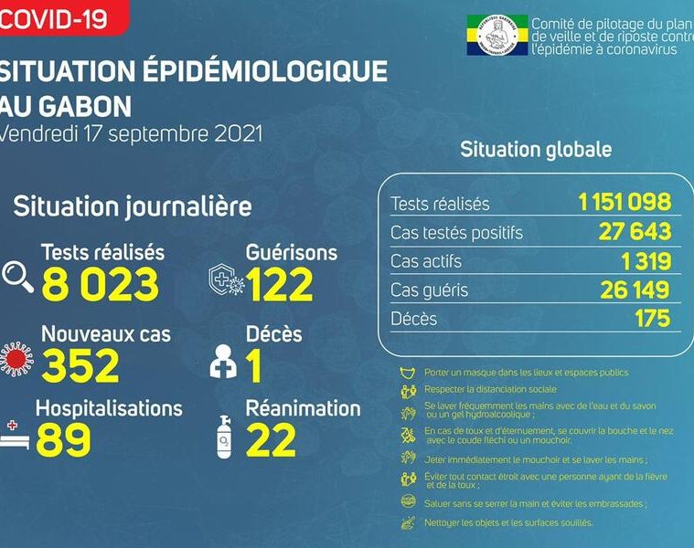Gabon Matin vous livre le point journalier du Comité de pilotage du plan de veille et de riposte contre l’épidémie à Coronavirus au Gabon du 17 septembre 2021.