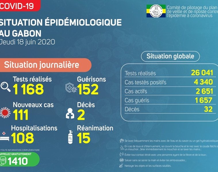 Gabon Matin vous livre le point journalier du Comité de pilotage du plan de veille et de riposte contre l’épidémie à Coronavirus au Gabon du 18 juin 2020.