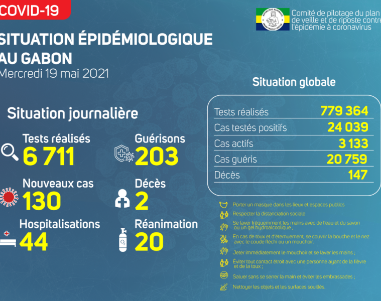Gabon Matin vous livre le point journalier du Comité de pilotage du plan de veille et de riposte contre l’épidémie à Coronavirus au Gabon du 19 mai 2021.