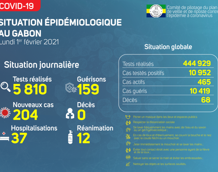 Gabon Matin vous livre le point journalier du Comité de pilotage du plan de veille et de riposte contre l’épidémie à Coronavirus au Gabon du 1er février 2021.