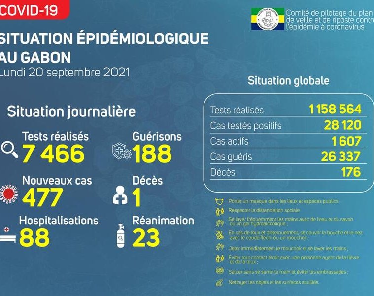 Nous avons enregistré 477 nouveaux cas positifs sur 7 466 tests réalisés, soit un taux de positivité de 6.4%, 88 personnes hospitalisées dont 23 en réanimation pour détresse respiratoire, 188 nouvelles guérisons et 01 nouveau décès à Port Gentil.