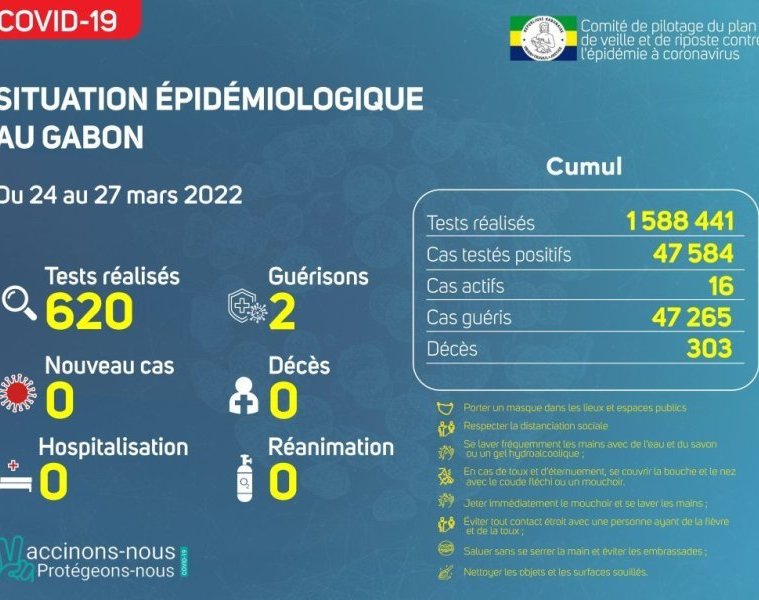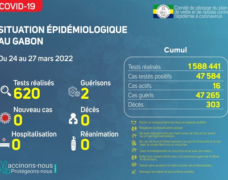 GabonMatin vous livre le point journalier du Comité de pilotage du plan de veille et de riposte contre l’épidémie à Coronavirus au Gabon du 27 mars 2022.