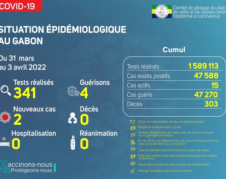 Le Gabon enregistré 02 nouveaux cas positifs sur 341 tests réalisés, soit un taux de positivité de 0.6%, 00 personne hospitalisée dont 00 en réanimation, 04 nouvelles guérisons et 00 nouveau décès.