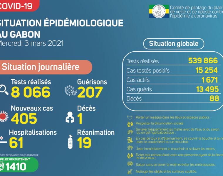 Gabon Matin vous livre le point journalier du Comité de pilotage du plan de veille et de riposte contre l’épidémie à Coronavirus au Gabon du 3 mars 2021.