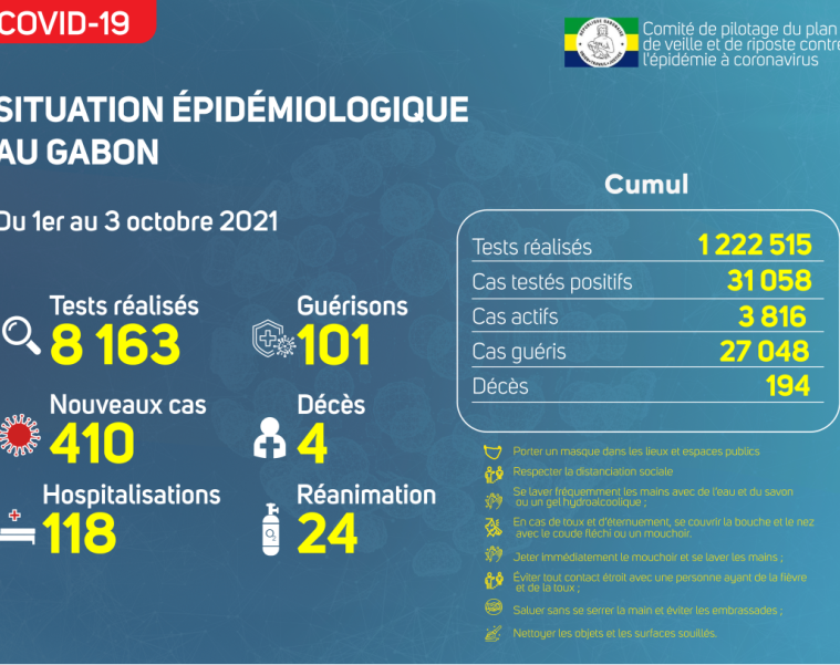 Nous avons enregistré 410 nouveaux cas positifs sur 8 163 tests réalisés, soit un taux de positivité de 5%, 118 personnes hospitalisées dont 24 en réanimation pour détresse respiratoire, 101 nouvelles guérisons et 04 nouveaux décès dont 02 à Libreville, 01 à Bitam et 01 à Port Gentil.
