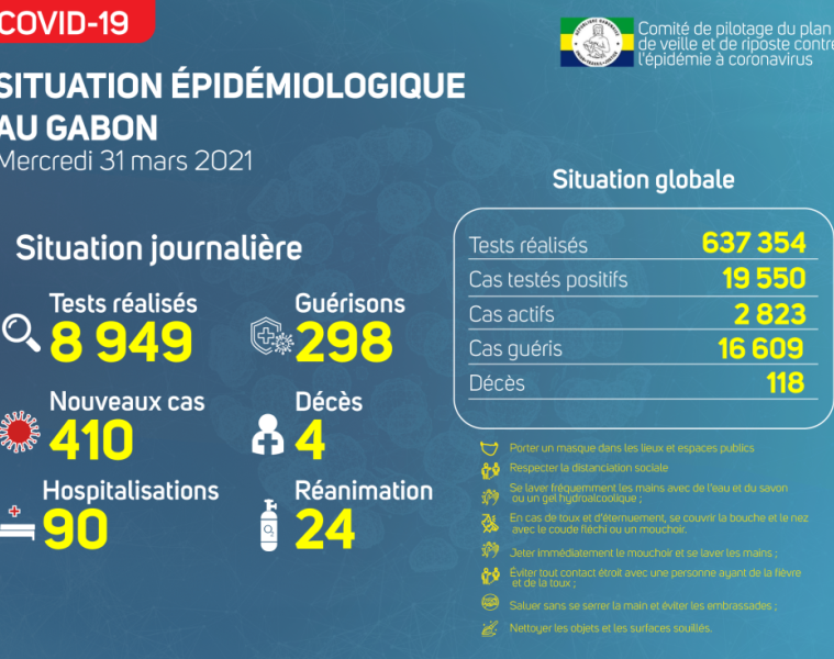 Nous avons enregistré 410 nouveaux cas positifs sur 8 949 tests réalisés, soit un taux de positivité de 4.6%, 90 personnes hospitalisées dont 24 en réanimation pour détresse respiratoire, 298 guérisons et 04 nouveaux décès notifiés à Libreville (03) et à Lambaréné (01).