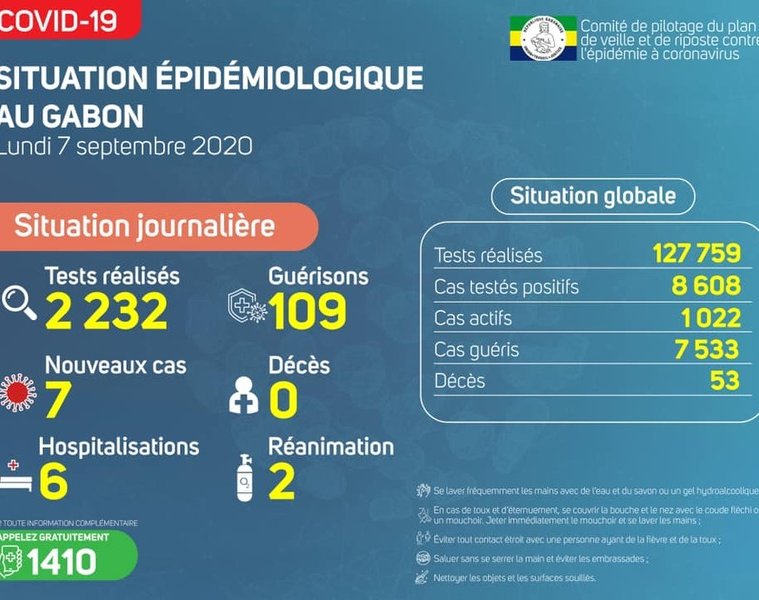Gabon Matin vous livre le point journalier du Comité de pilotage du plan de veille et de riposte contre l’épidémie à Coronavirus au Gabon du 7 septembre 2020.