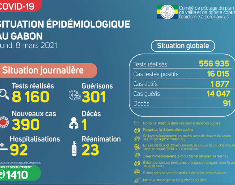 Sur le plan épidémiologique, nous avons enregistré 390 nouveaux cas positifs sur 8 160 tests réalisés, soit un taux de positivité de 4,7%, 92 personnes hospitalisées dont 23 en réanimation pour détresse respiratoire et 01 nouveau décès a été notifié à Libreville, soit un total de 91 décès. Le nombre de guérisons est de 301 et le nombre de cas actifs est de 1 877.