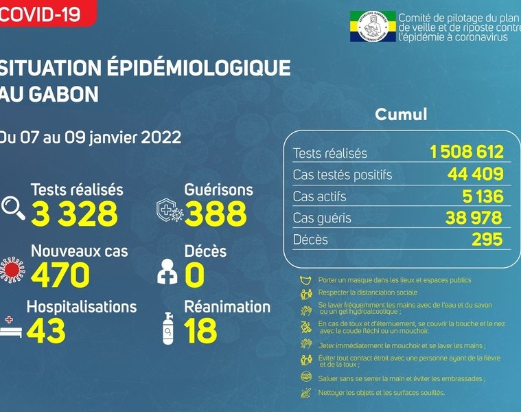 GabonMatin vous livre le point journalier du Comité de pilotage du plan de veille et de riposte contre l’épidémie à Coronavirus au Gabon du 9 janvier 2022.