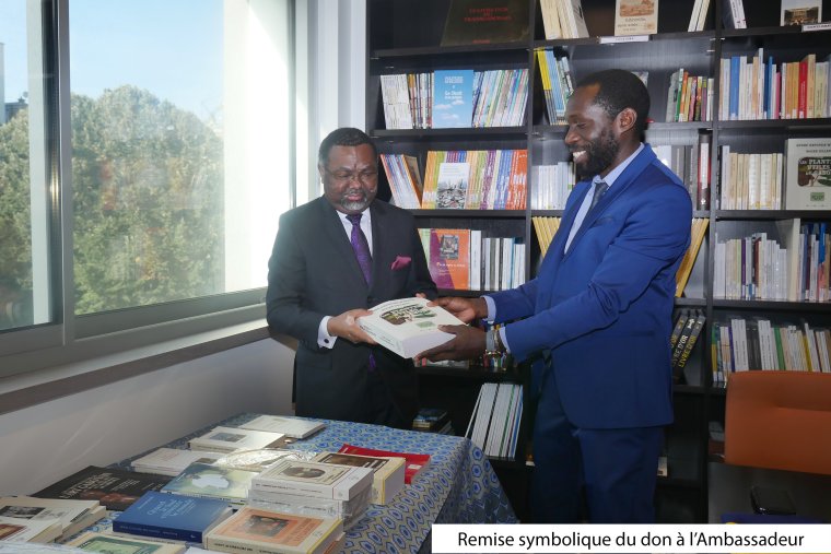 Composé d’une trentaine de livres sur le Gabon, ce don vient enrichir le fonds Gabon de la Bibliothèque. S’exprimant au nom du Bureau et des membres de l’Association, le Président a inscrit ce don dans « le registre de la contribution patriotique à la promotion de la culture gabonaise et de l’encouragement de l’initiative des autorités gabonaises qui a consisté à créer une bibliothèque au sein de l’Ambassade ».