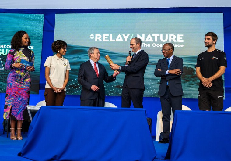 En clôture de l’événement, le chef de l’ONU a participé à une cérémonie Relay4Nature, recevant un bâton témoin, qui a commencé son tour du monde en mai 2021 pour appeler les dirigeants mondiaux à augmenter radicalement leurs ambitions de protection des mers.