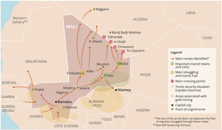 ONUDC, Principaux itinéraires de trafic de migrants dans et vers le Mali (2020/2021)